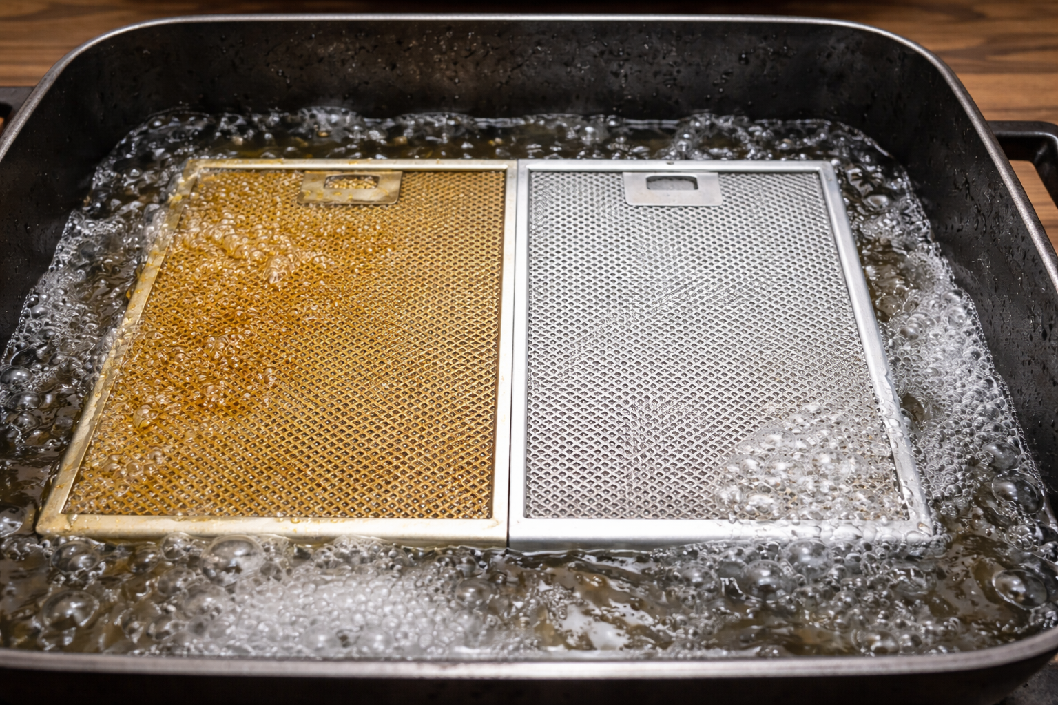 Uz virtuves nosūcējs atkal spīdiet, nav vajadzīgas kodīgas ķīmiskas vielas, kas liek asarot acis. Noslēpums slēpjas pareizā temperatūras apstrādē un vienkāršā virtuves rīkā, kas ir pieejams ikvienam. Galvenais ir pareizi sagatavoties tvaika nosūcēja filtri. Noņemiet metāla sietu un ievietojiet tos dziļā cepešpannā vai baseinā.