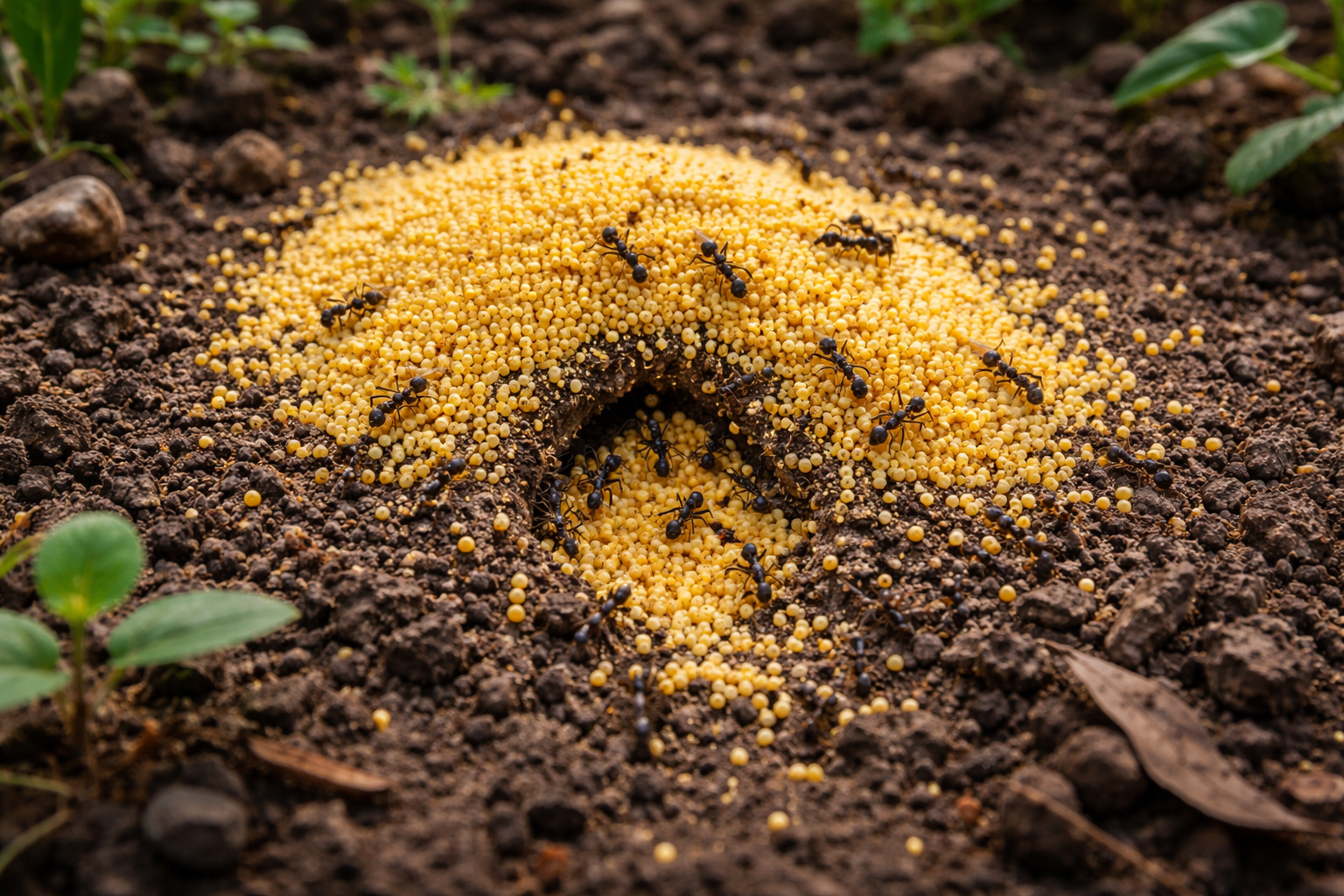 Prosas graudaugi nestandarta veidā iedarbojas uz kukaiņiem, no nekaitīga produkta pārvēršoties par spēcīgu līdzekli vietas tīrīšanai. Dārza kaitēkļi mazos dzeltenos graudiņus sajauc ar savas karalienes olām vizuālās un taustes līdzības dēļ. Strādājošie indivīdi tos aktīvi nes dziļi skudru pūznī. Nokļūstot ligzdā, labība intensīvi uzbriest no augsnes mitruma, fiziski bloķējot pazemes ejas. Turklāt kukaiņi nespēj sagremot uzbriedušo cieti, kas izraisa kolonijas nāvi, mēģinot patērēt pārtikas rezerves.