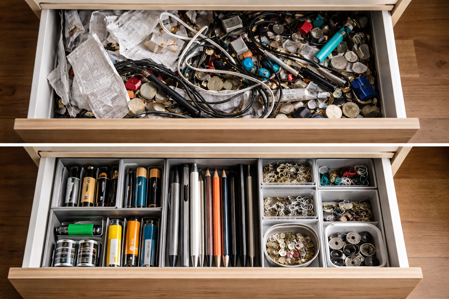 Kvītis, vecas baterijas, saspraudes un pogas, kas izkaisītas pa virsmām, rada nopietnu vizuālais troksnis. Šis faktors tieši ietekmē iekšējās spriedzes līmeni un traucē pienācīgai atpūtai pēc garas dienas. Mūsu smadzenes mazo priekšmetu pārpilnību interpretē kā nepabeigtus uzdevumus, tāpēc mēs pastāvīgi jūtamies noguruši pat savā viesistabā.