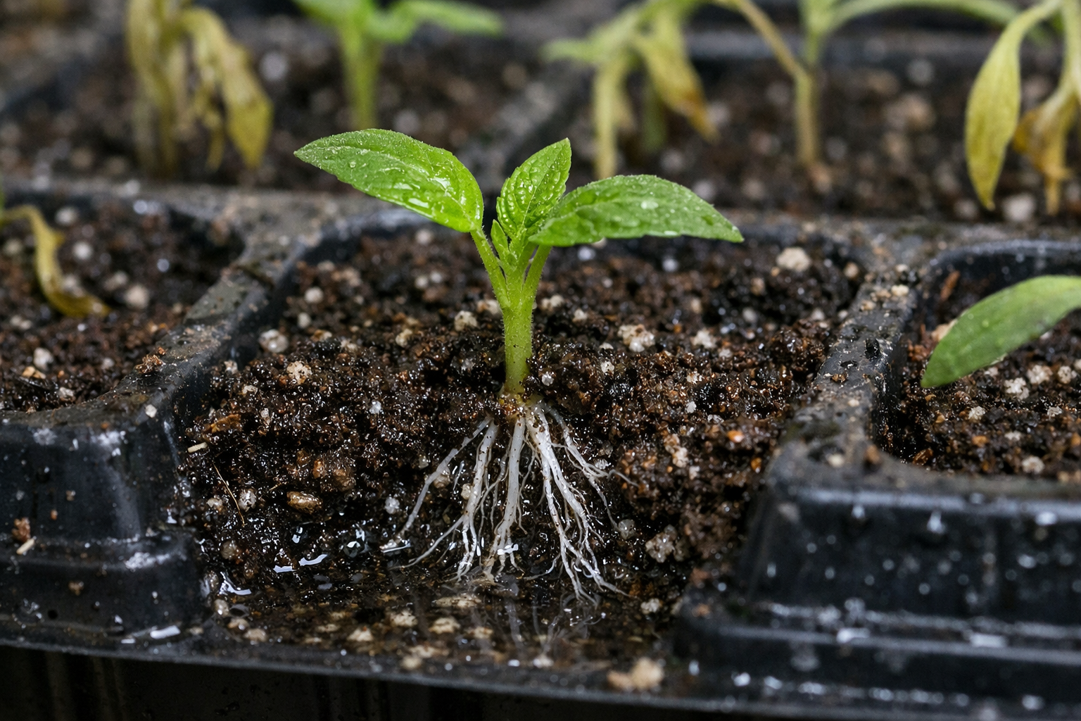 Kad sēklas dīgst mājās, tām ļoti trūkst skābekļa blīvajā stādu augsnē. Regulāri ūdeņraža peroksīds darbojas kā spēcīgs aerators un dabisks stimulants. Nokļūstot zemē, tas acumirklī sadalās ūdenī un atomu skābekliskas attīra augsni no patogēniem un acumirklī uzsūcas jaunajās saknēs.