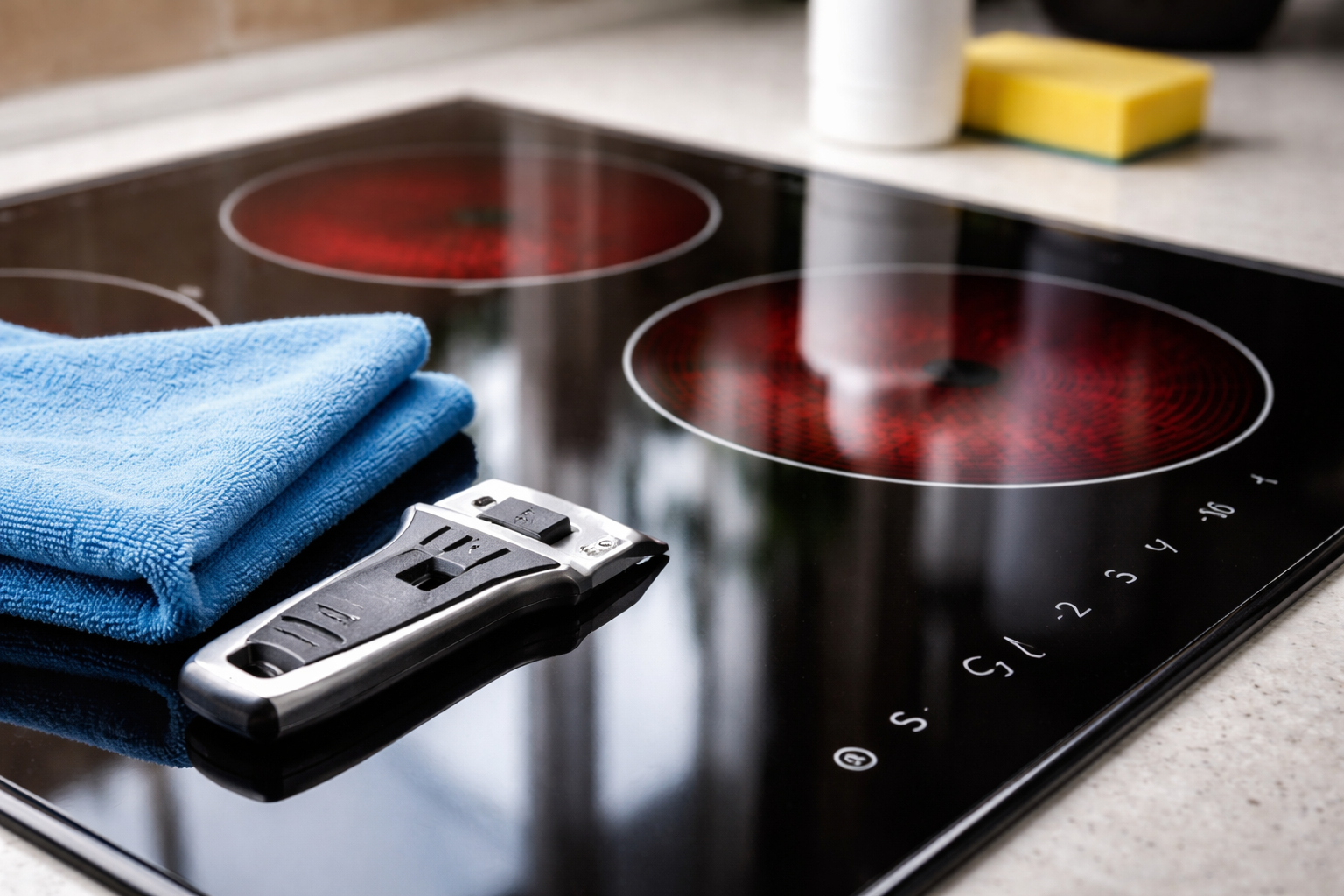 Skrāpis stikla keramikai glīti nogriež blīvās oglekļa nogulsnes, nemaz nesabojājot gludo virsmu.
