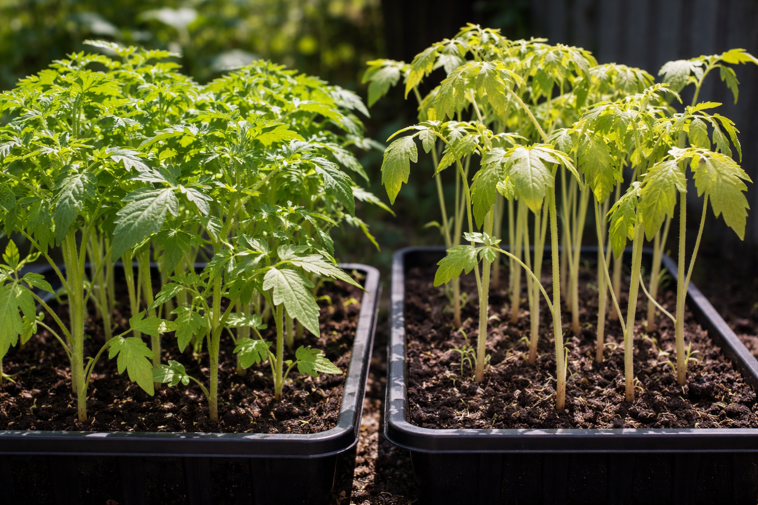 Tomāti ir ļoti atkarīgi no saules gaismas pārpilnības no pirmajām dzīves dienām. Kad stādi stāv ēnā vai uz palodzes ar sliktu apgaismojumu, process sākas uzreiz etiolācija. Kāts strauji pagarinās, meklējot enerģijas avotu, kļūst plānāks un zaudē savu elastību. Jauna auga audi kļūst vaļīgi, un sakņu sistēma pilnībā pārstāj attīstīties, visus resursus veltot topa izvilkšanai.