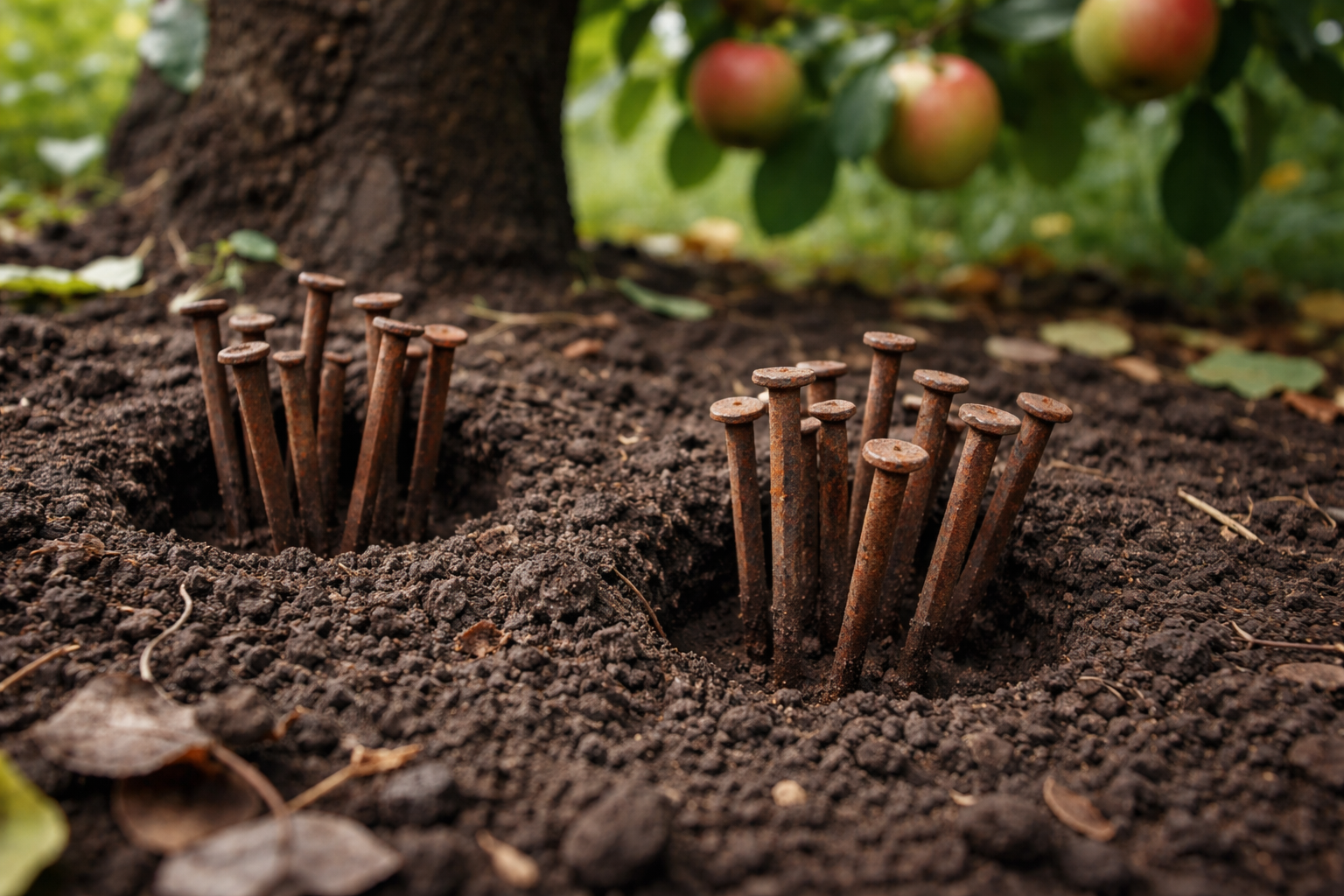 Ir svarīgi saprast, ka ne katrs metāla gabals dos labumu dārzam. Varš, alumīnijs vai mūsdienīgi sakausējumi ar pretkorozijas pārklājumu gulēs zemē kā pašsvars, neiesaistoties nepieciešamajās ķīmiskajās reakcijās. Kokam ir nepieciešams tieši rūsējošais melnais dzelzs.