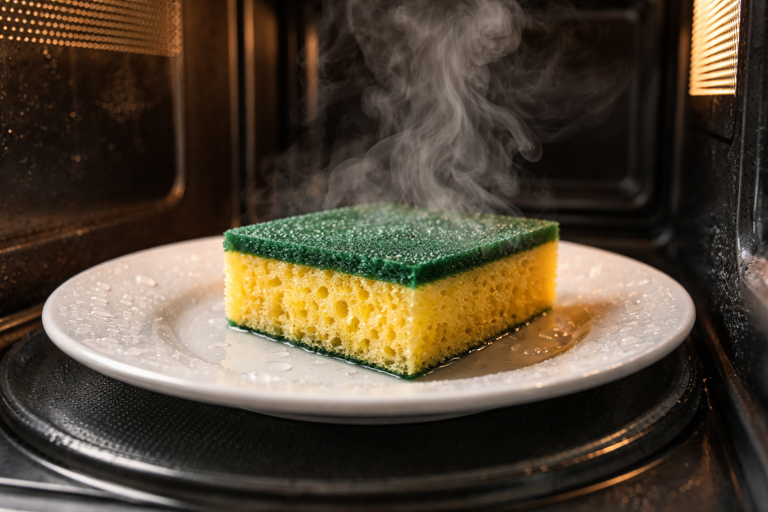 Slepena nianse: pirms ievietošanas mikroviļņu krāsnī, sūklis ir bagātīgi jāsamitrina ar ūdeni, pretējā gadījumā sausais materiāls vienkārši izkusīs vai pat aizdegsies kameras iekšpusē.