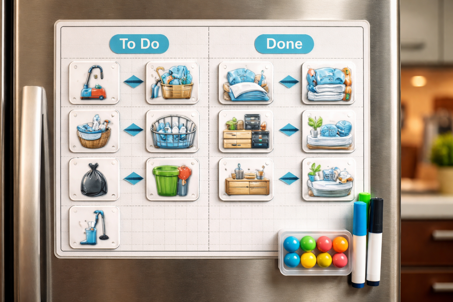 Slepens padoms: izveidojiet vizuālu tāfeli ar magnētiem, kur katrs ģimenes loceklis var patstāvīgi atzīmēt izpildītos uzdevumus, ar prieku pārvietojot tos no kolonnas “darāms” uz kolonnu “paveikts”.
