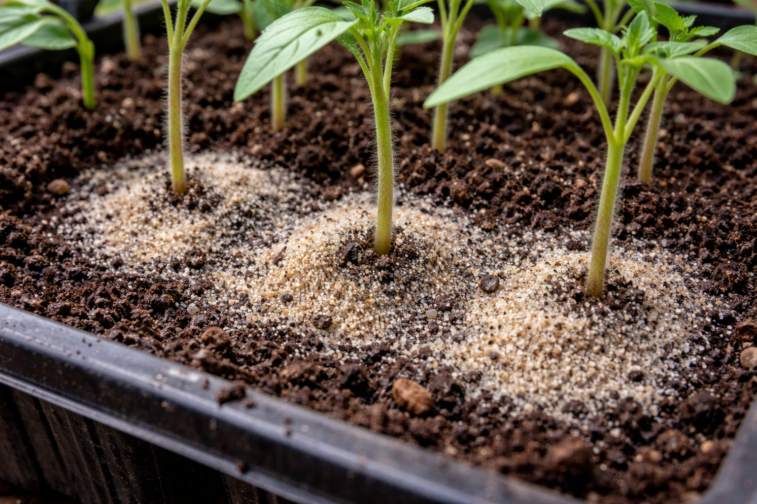 Tiklīdz pamanāt stublāja retināšanu pie zemes, jārīkojas zibens ātrumā. Mana pārbaudītā metode ir izmantot parastās upes smiltis un koksnes pelnus.