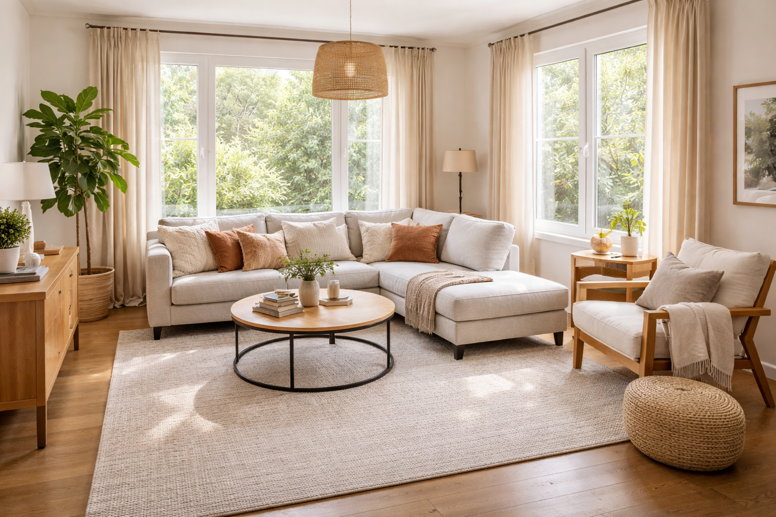 Novietojiet lielas mīkstās mēbeles stingri gar garu sienu, lai izlabotu pārāk iegarenās telpas proporcijas.