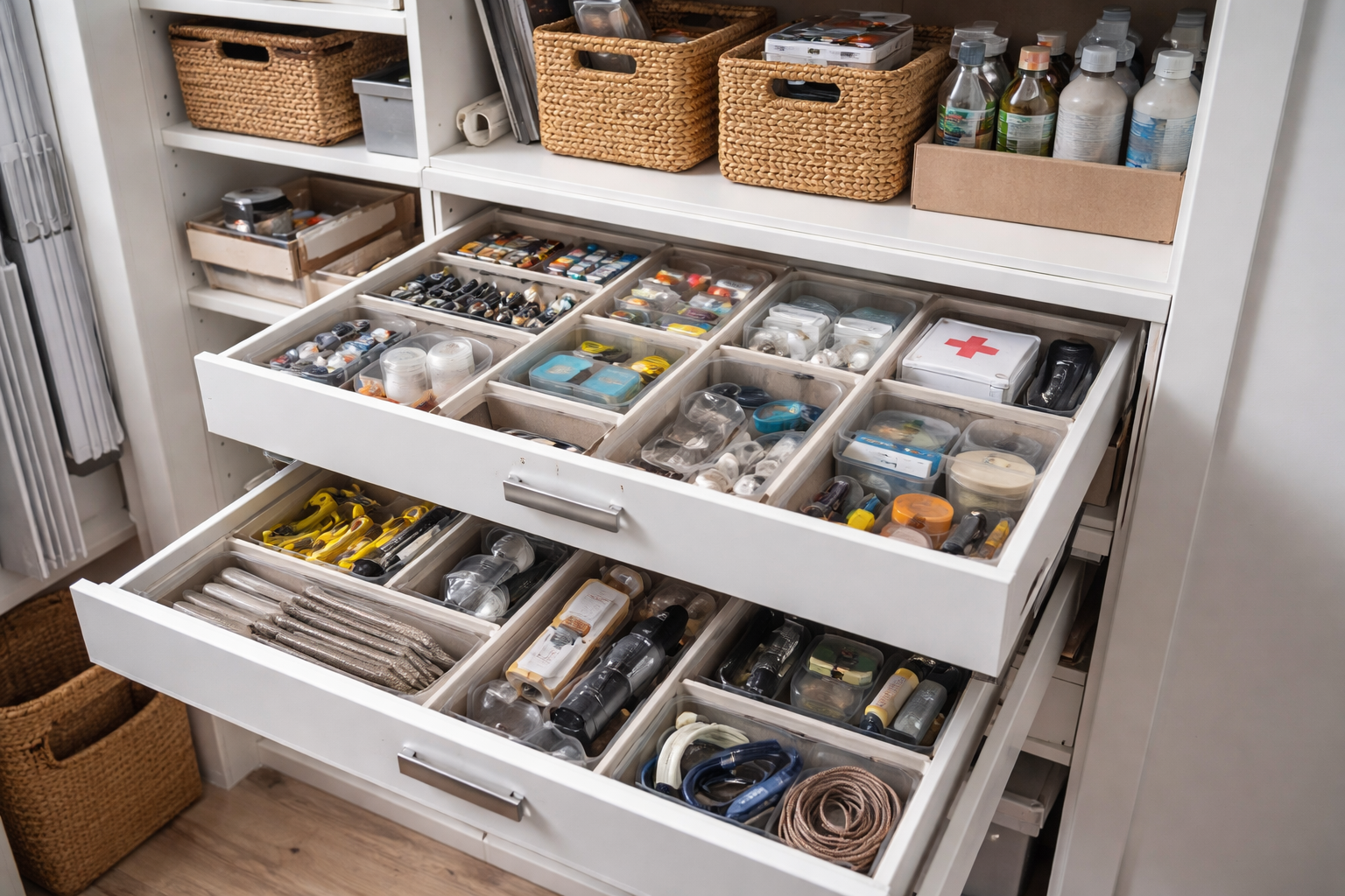Pārvietojiet visus mazos priekšmetus no atvērtām darba virsmām uz nosegtiem, necaurspīdīgiem konteineriem.