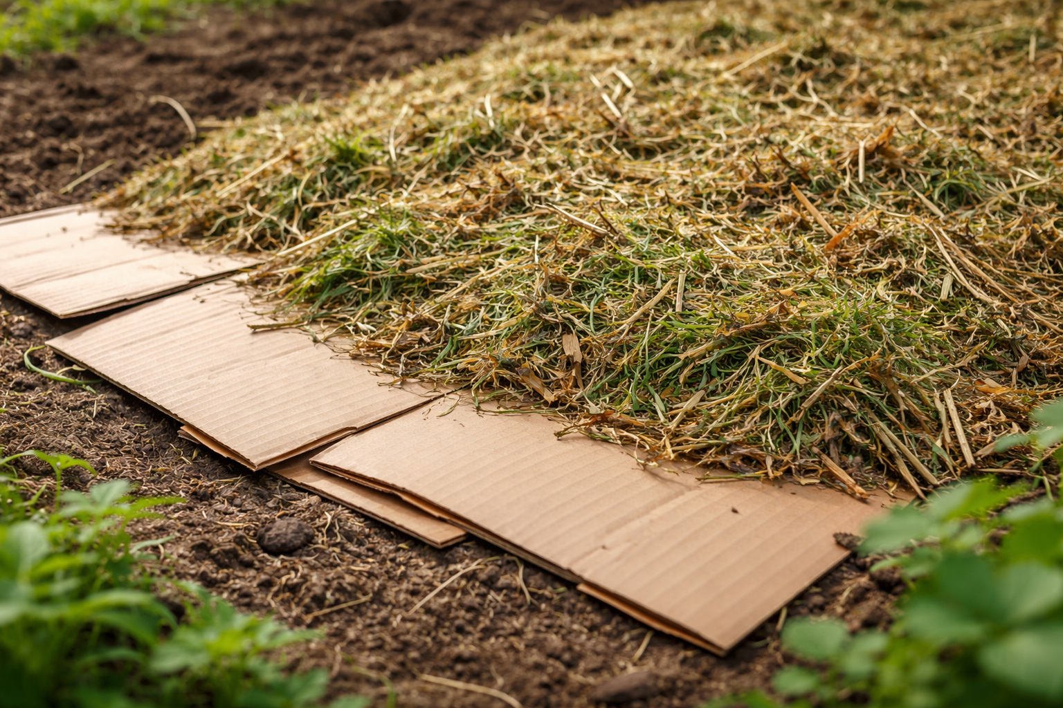 Cieši, bez lentes, uzlieciet parastā gofrētā kartona loksnes virs nezāļu zonas.