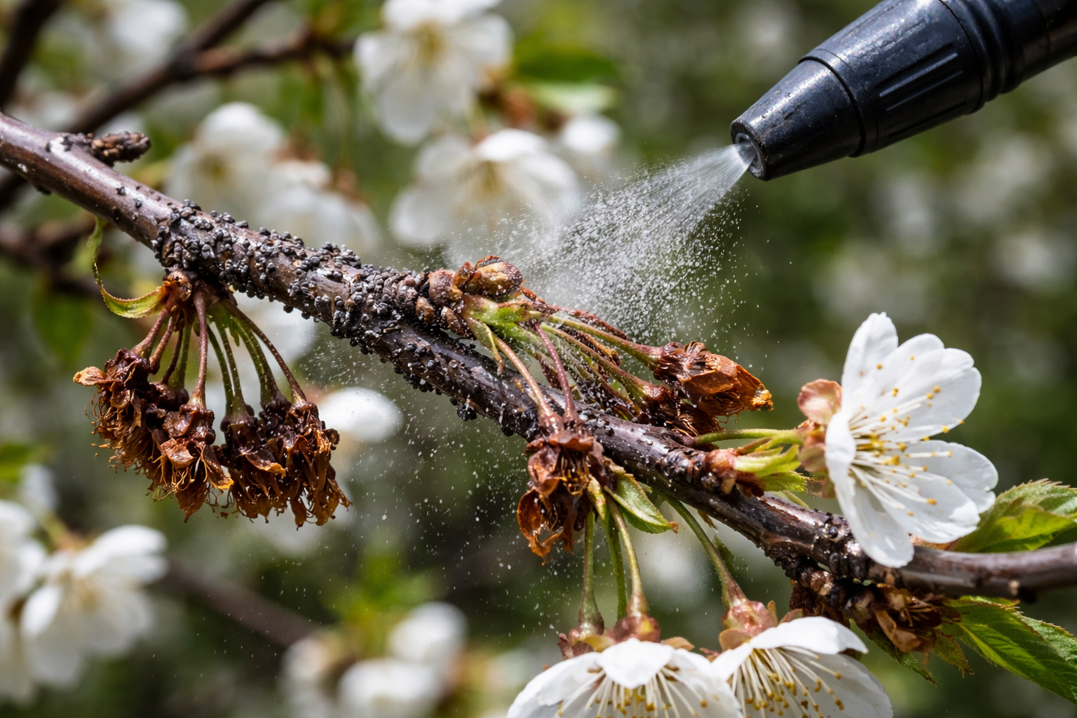 Slepenā nianse slēpjas apstāklī, ka primārā infekcija notiek tieši caur atvērta zieda piedziņu, tāpēc koki ir jāsmidzina stingri noteiktā fāzē – gar rozā pumpuru un tūlīt pēc ziedlapu nokrišanas.