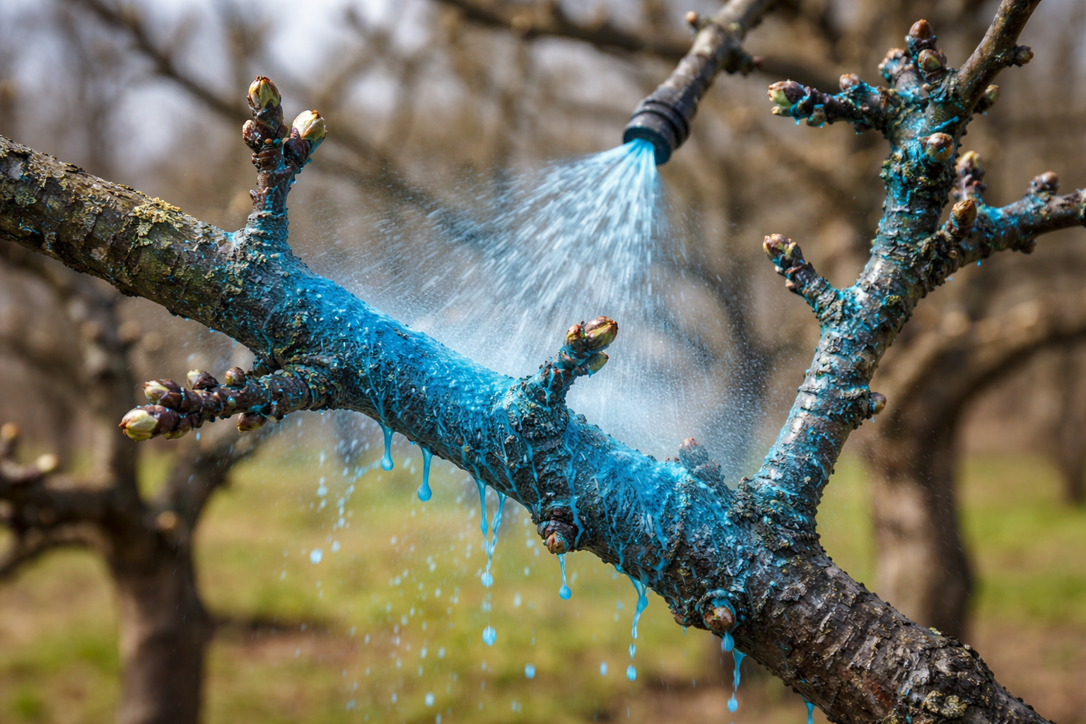 Šķīdums veido neredzamu aizsargplēvi uz mizas virsmas. Šī barjera neļauj patogēniem mikroorganismiem iekļūt audos pēc sniega kušanas un temperatūras iestāšanās virs nulles.
